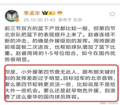 媒体人季孟年社媒发文点评道:“小外援第四节查无此人,跟布朗关键时刻的发挥差距过于明显。目标冠军的北京首钢,要么第四节轮转更灵活一些,比如说是不是给大外一些机会。要么还是趁早物色外援,别浪费了这么豪华的国内球员阵容。”。