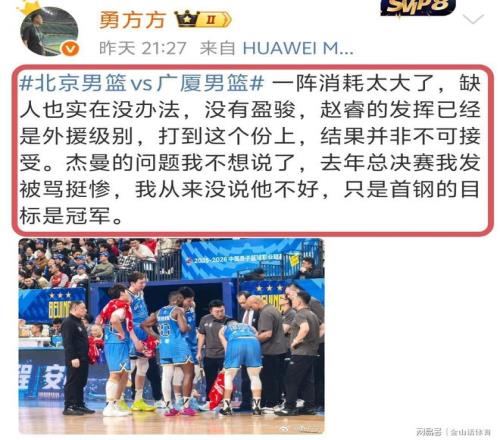 媒体人勇方方社媒发文点评道:“一阵消耗太大了,缺人也实在没办法,没有盈骏,的发挥已经是外援级别,打到这个份上,结果并非不可接受。杰曼的问题我不想说了,去年总决赛我发被骂挺惨,我从来没说他不好,只是首钢的目标是冠军。”。