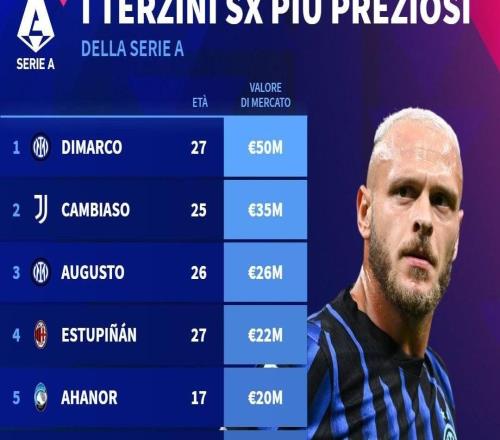 德转列意甲左后卫身价:迪马尔科5000万欧居首,坎比亚索第二 -